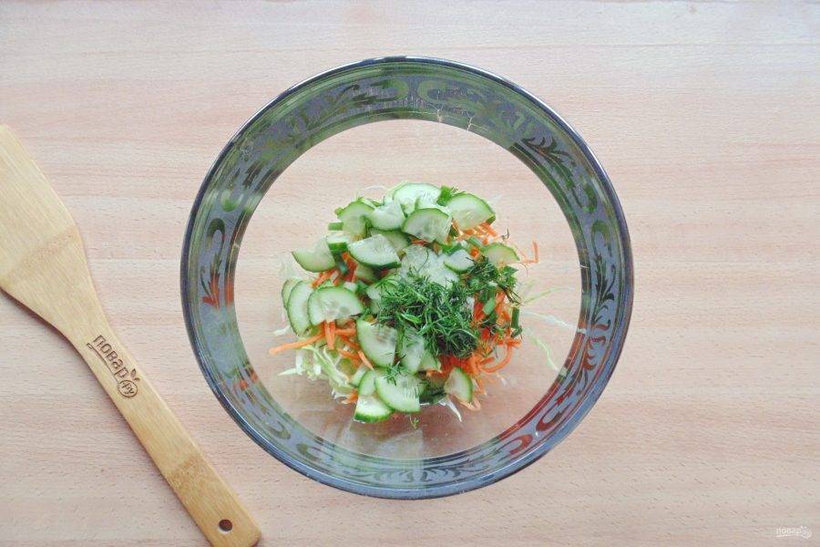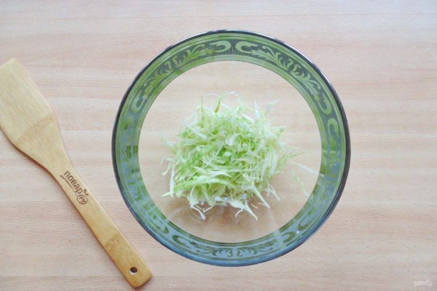 Молодую капусту нарежьте тонкой соломкой и выложите в салатник.