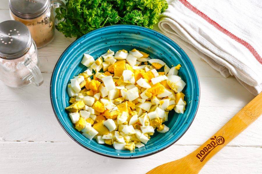 Отварные куриные яйца очистите от скорлупы, промойте в воде и нарежьте кубиками. Высыпьте нарезку в салатник.