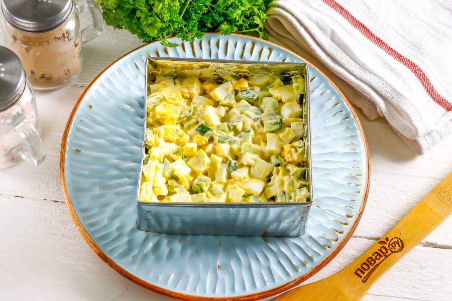 Выложите салатную основу на тарелку или на блюдо через кулинарное кольцо или квадрат.