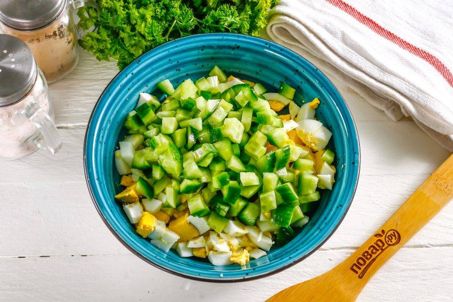 Точно так же поступите и со свежим огурцом, срезая хвостики с обеих его сторон. Посолите огуречную нарезку и оставьте на 5-10 минут, чтобы из нее выделился сок. Если этого не сделать, то салат может "поплыть".