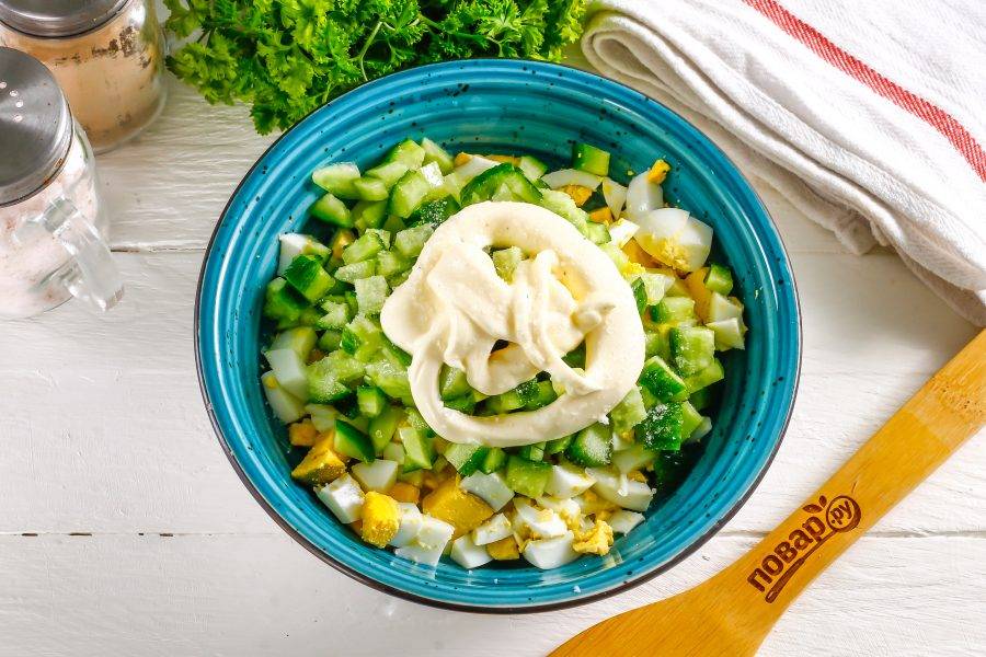Добавьте в емкость к нарезкам майонез любой жирности и аккуратно все перемешайте. Сметаной майонез заменять нельзя!