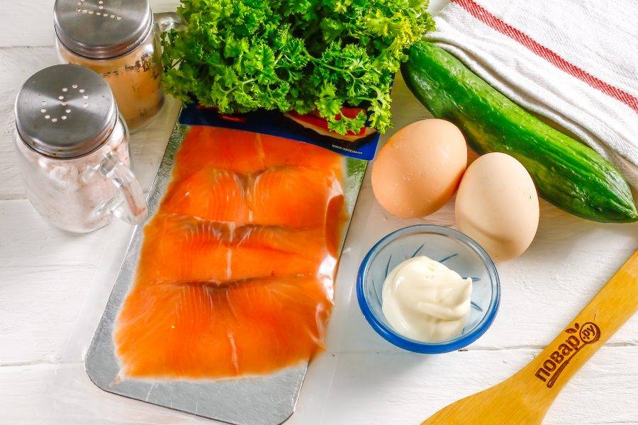 Подготовьте указанные ингредиенты. Красную рыбу приобретите готовую, слабосоленую или засолите сами в домашних условиях.