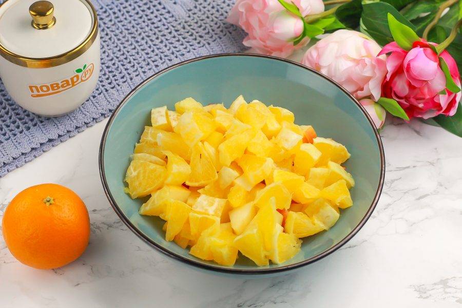 Апельсин очистите от кожуры и белых волокон. Разделите плод на дольки и нарежьте их на части, удаляя косточки. Добавьте в емкость.