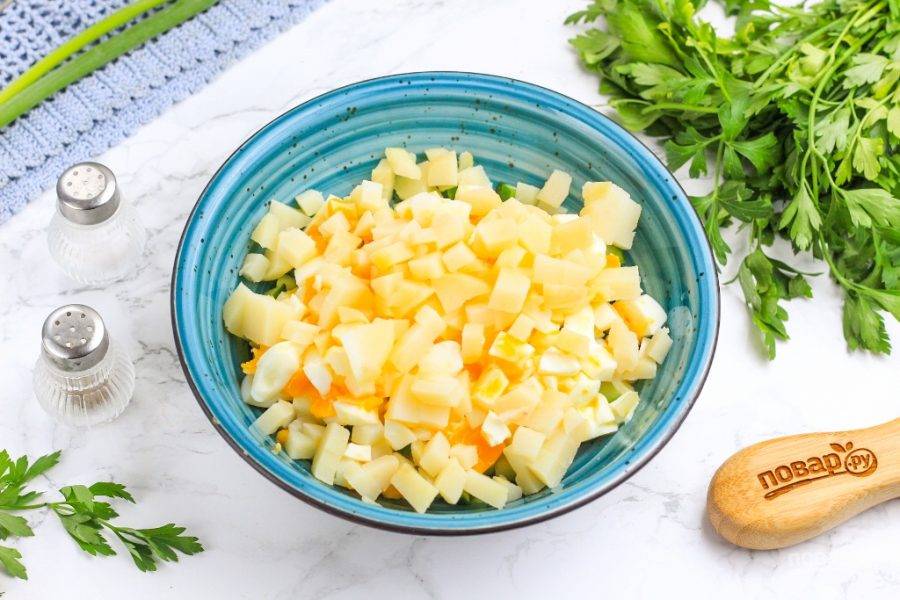 Срежьте кожу с куска слабосоленой масляной рыбы, нарежьте мякоть мелкими кубиками. Измельчите промытый зеленый лук и добавьте обе нарезки в емкость к другим ингредиентам. Всыпьте молотый черный перец. На этом этапе можно добавить и измельченный укроп, петрушку.