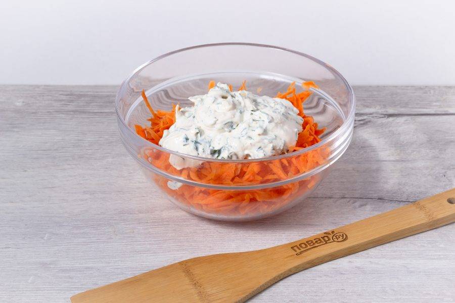 Добавьте соус к моркови, перемешайте, посолите салат по вкусу.