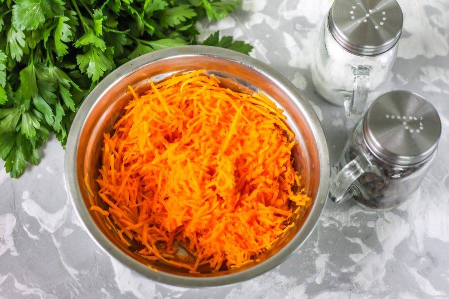 Морковь очистите от кожуры, промойте и натрите на терке с мелкими ячейками в салатник или миску.