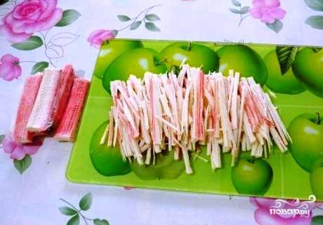 Крабовые палочки нарезаем соломкой.