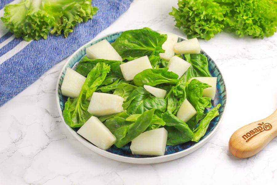 Срежьте стебли шпината и стряхните лишнюю влагу, выложите листья на тарелку.
