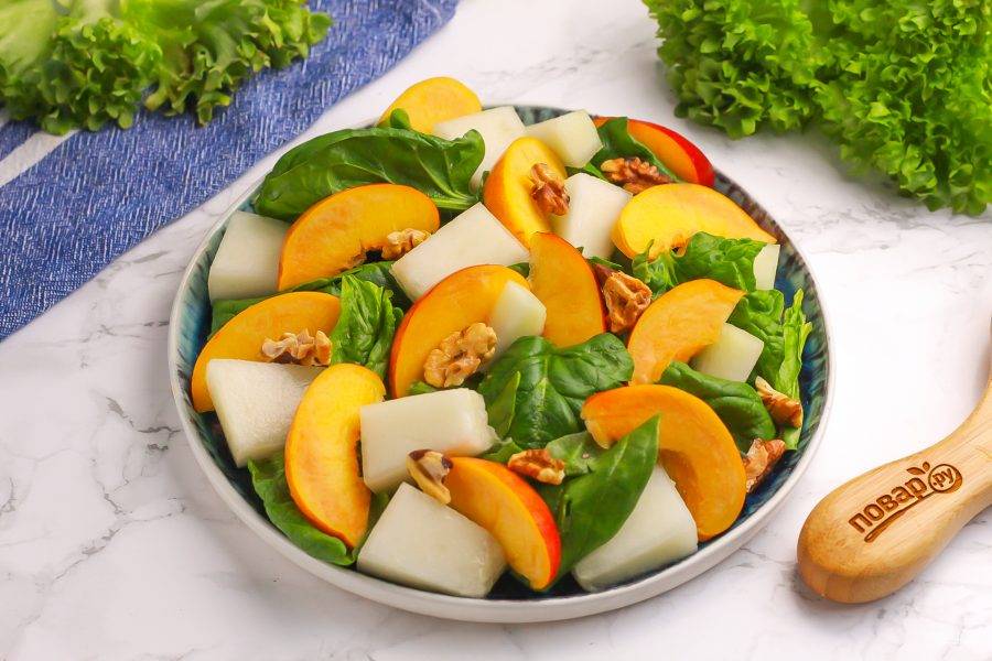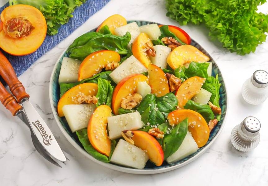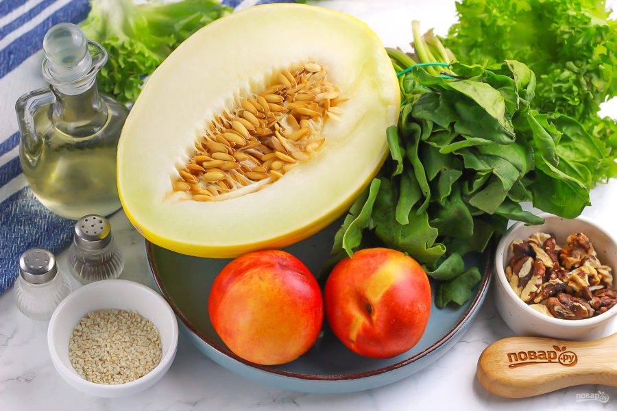 Яркий и красочный салат с нектаринами и дыней — настоящий взрыв вкуса! Обязательно его приготовьте и насладитесь замечательным миксом, приправленным орехами, семенами кунжута и специями. Пробуйте!