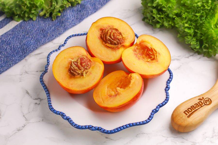 Разрежьте нектарины пополам до косточки и удалите ее в каждом фрукте.