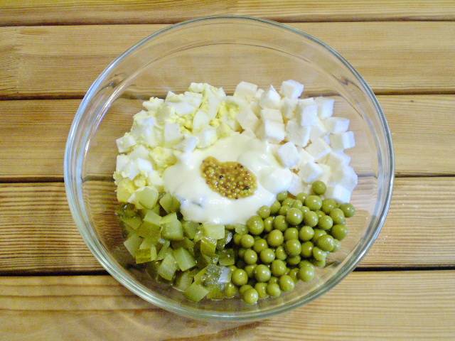 6. Все ингредиенты салата сложите в салатник, добавьте горчицу, майонез, соль, перец черный молотый, зелень.