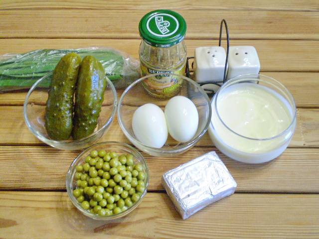 1. Приготовим продукты. Огурцы для салата используйте сезонно, зимой - консервированные, летом - свежие. Что касается сыра, на ваш вкус, отлично подойдет как плавленый, так и твердый сыр.