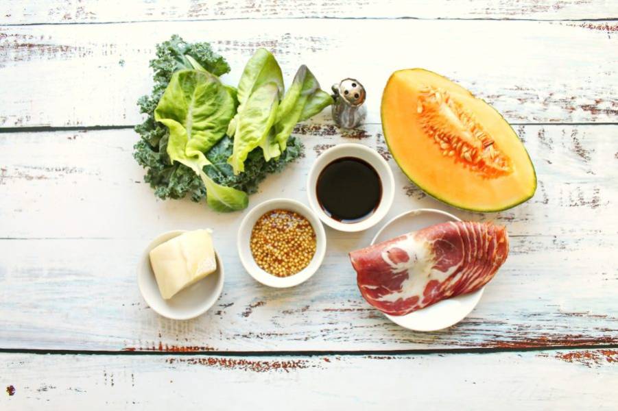 Подготовьте все необходимые ингредиенты для приготовления салата с пармой, козьим сыром и дыней. Салатные листья, дыню вымойте и обсушите.