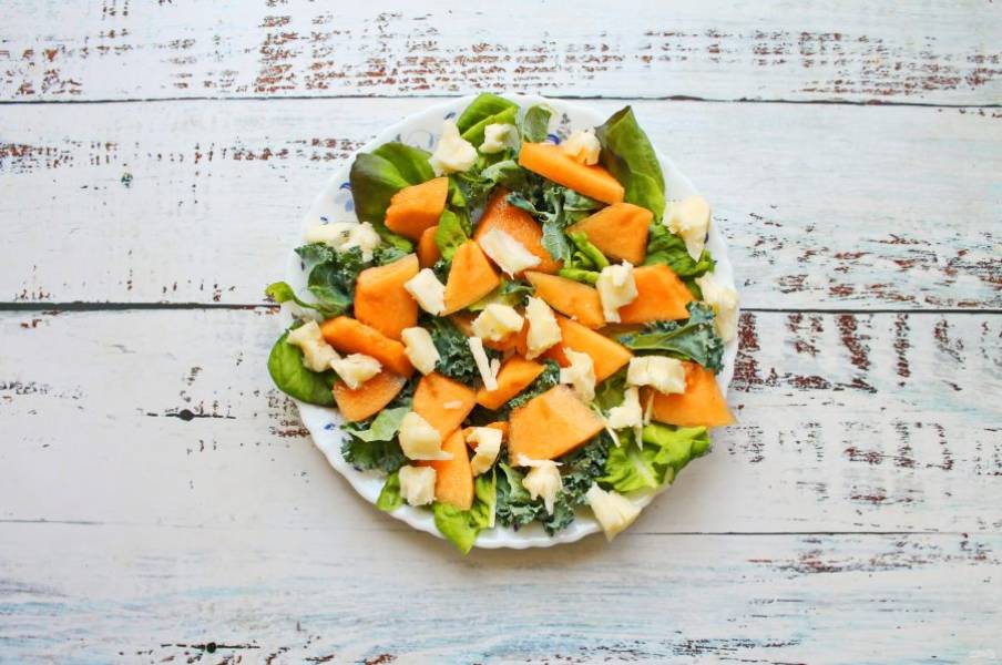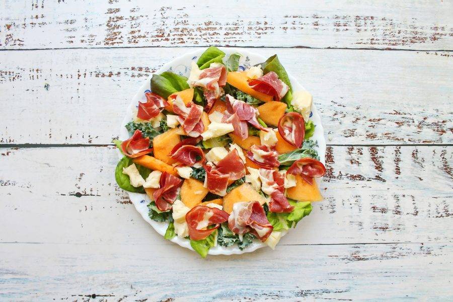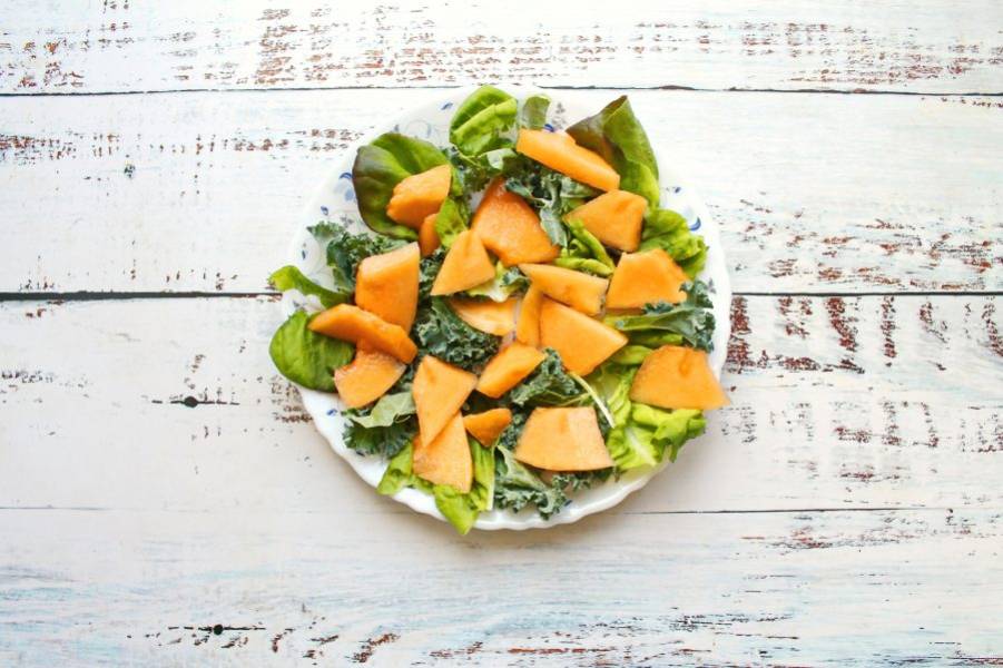 У дыни удалите семена, срежьте корку и нарежьте ее на дольки. Выложите дыню на листья салата.