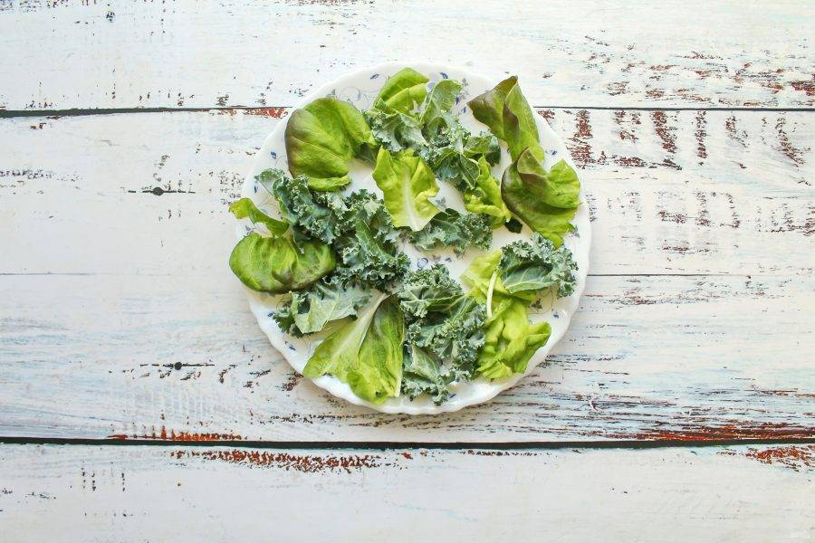 Листья салата порвите руками и выложите на сервировочное блюдо.