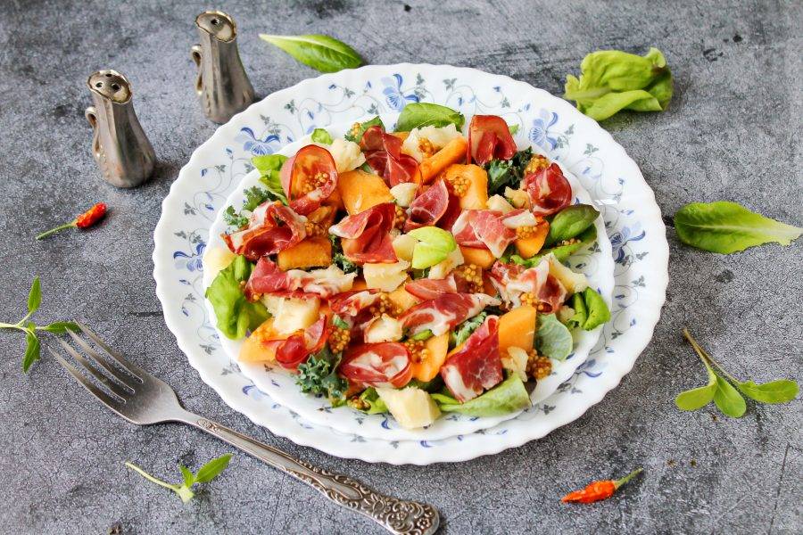 Полоски пармы сложите в кудряшки и выложите по поверхности салата.