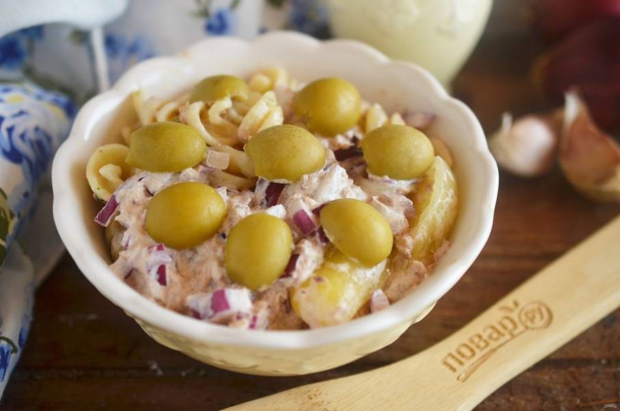 Прекрасный рыбный салат на основе пасты вполне подойдет даже для праздничного стола.