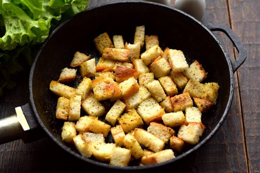 Нарезку батона выложите на сухую сковороду, установленную на средний огонь. Добавьте соль, ароматные травы и другие специи по вкусу. Чтобы пряности лучше пропитали хлеб, сбрызните его оливковым маслом. Жарьте хлеб 2 минуты, постоянно перемешивая лопаткой, в конце добавьте измельченный чеснок. Затем огонь уберите, сухарики оставьте на горячей сковороде, чтобы они еще больше подсохли.