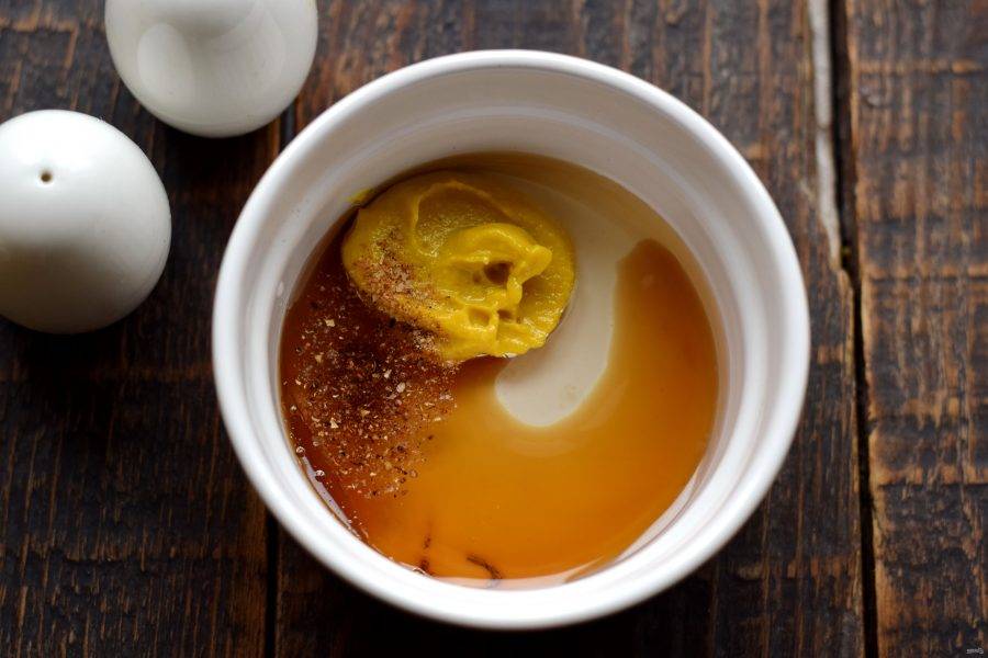 Отдельно приготовьте заправку. В пиалочку влейте соевый соус, бальзамический уксус, добавьте горчицу, соль и перец по вкусу. Смесь тщательно перемешайте до однородности.