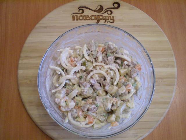 Сытный и калорийный салат с отварной печенью. Заправлен салат майонезом, можно заменить его сметаной или другим соусом.
