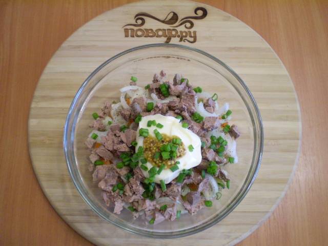 7. Заправляем салат майонезом и горчицей. Солим, перчим по вкусу, добавляем зелень.