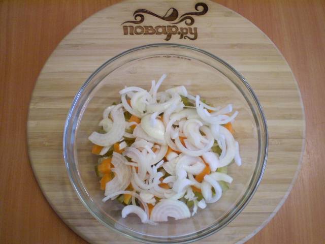 5. Добавляем порезанный полукольцами лук. Сразу присолите его, чтобы он сок пустил и чуточку потерял горечь.