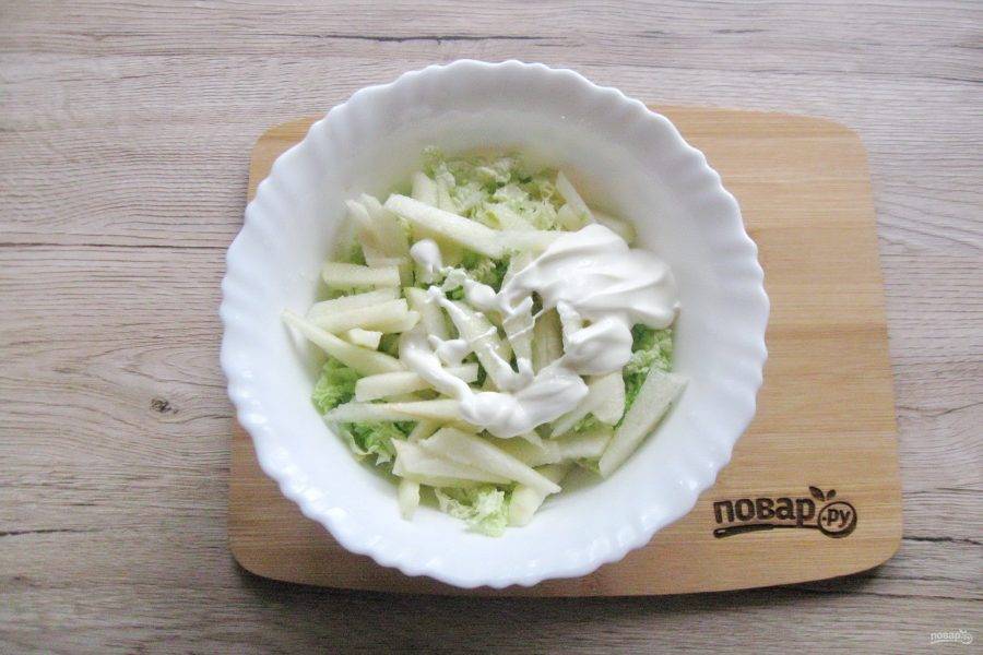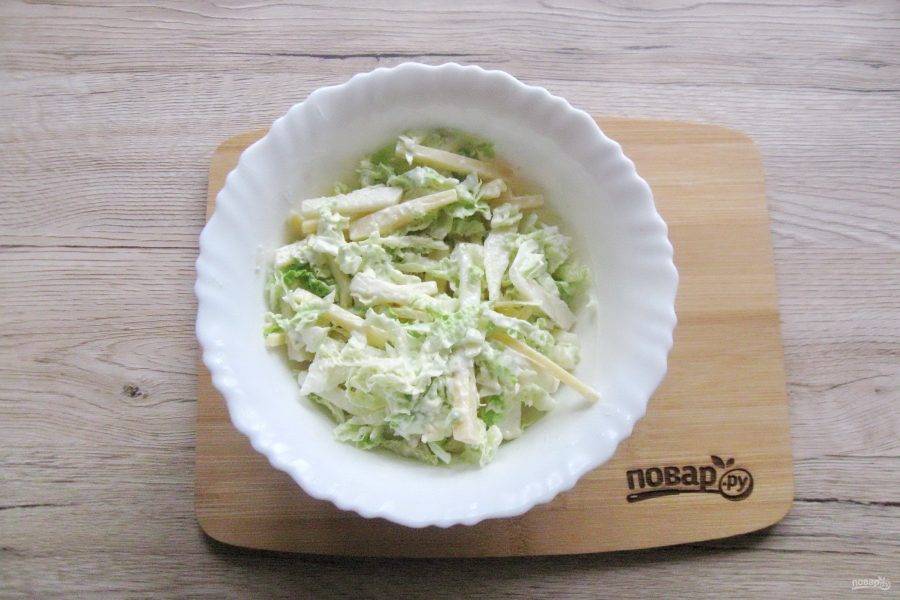 Листья пекинской капусты хорошо ополосните и нарежьте тонко. Добавьте в салатник.