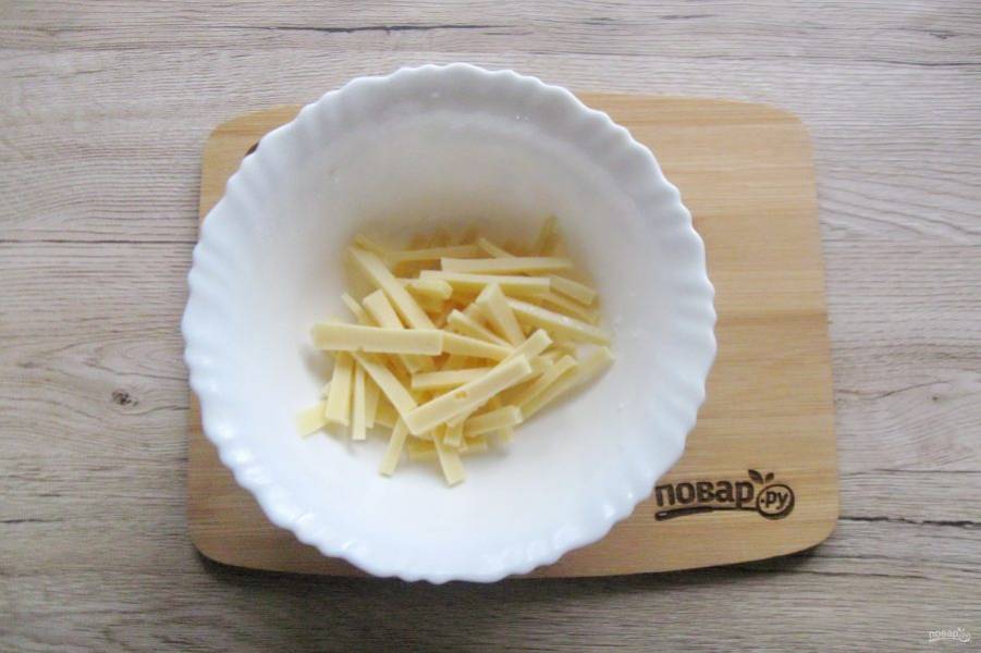 Грушу вымойте, очистите, удалите плодоножку и семенную коробочку. Нарежьте как и сыр, соломкой. Переложите в салатник. Взбрызните лимонным соком, чтобы груша не потемнела.