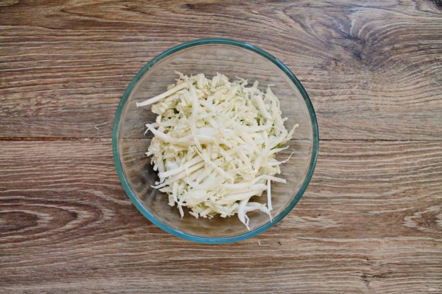 Капусту порежьте тонкой соломкой и добавьте к огурцу.