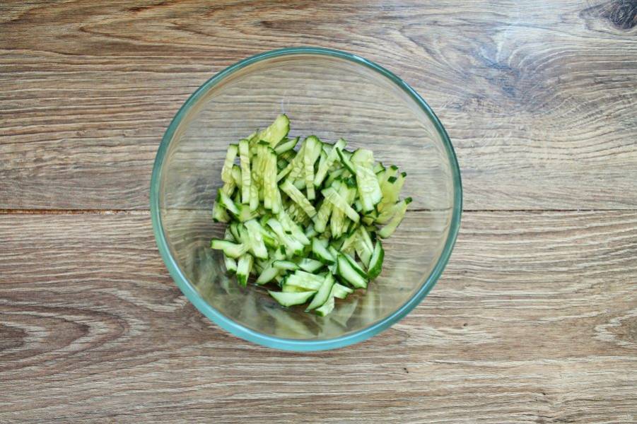 Свежий огурец порежьте средней соломкой и выложите в салатник.