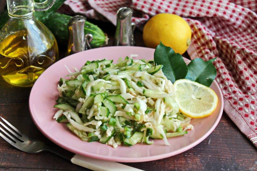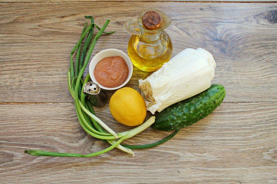 Для рецепта возьмите пекинскую капусту, икру трески и свежие огурцы. Для заправки понадобится оливковое масло и лимонный сок. Салат получается вкусный и диетический.