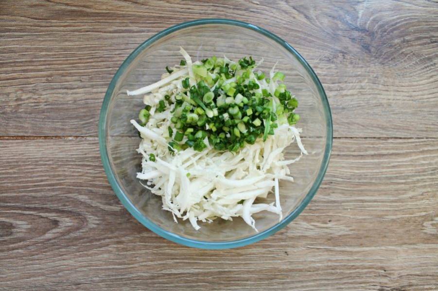 Зеленый лук порежьте и выложите в миску с капустой и огурцом.