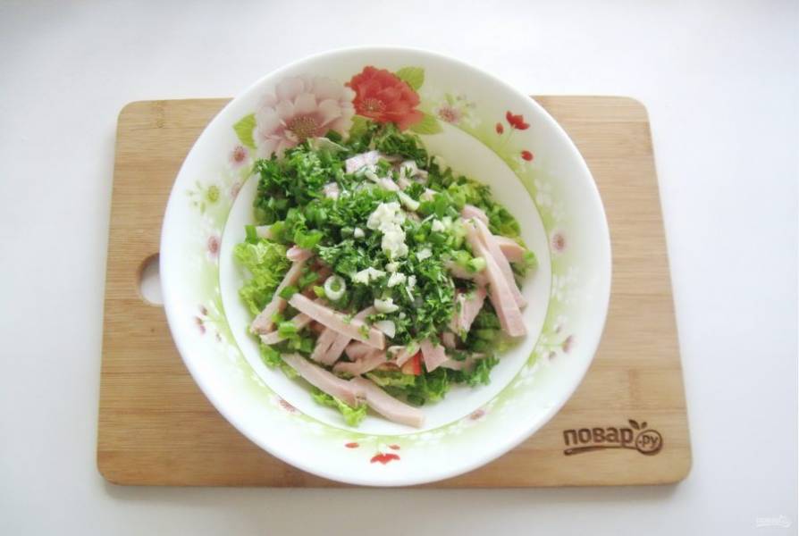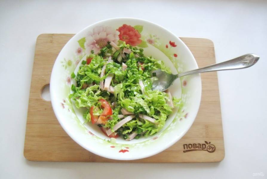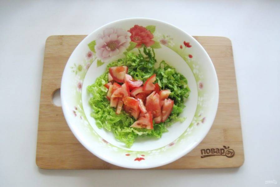 Пекинскую капусту нарежьте соломкой и выложите в салатник.
