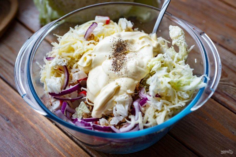 Добавьте майонез, соль и черный перец. Все перемешайте.