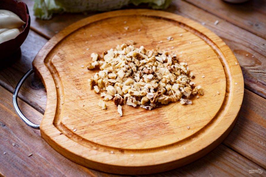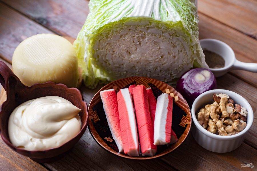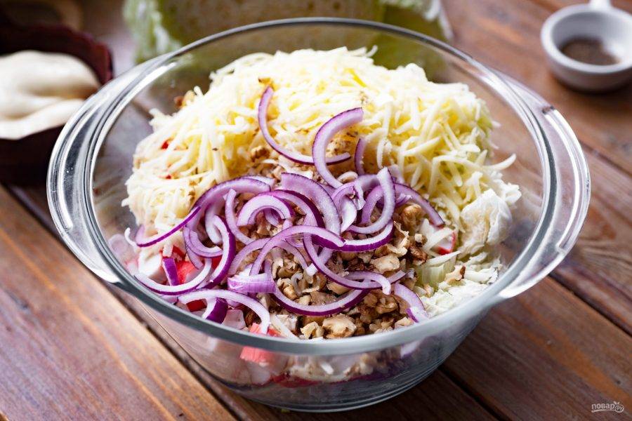 В просторную миску выложите пекинскую капусту, сыр, крабовые палочки и грецкие орехи.