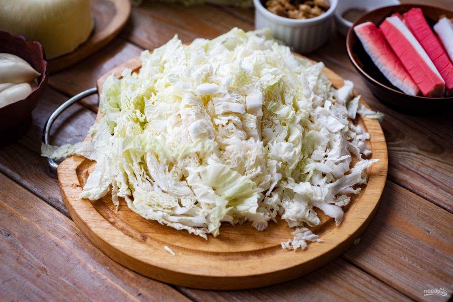 Нашинкуйте пекинскую капусту тонкой соломкой.