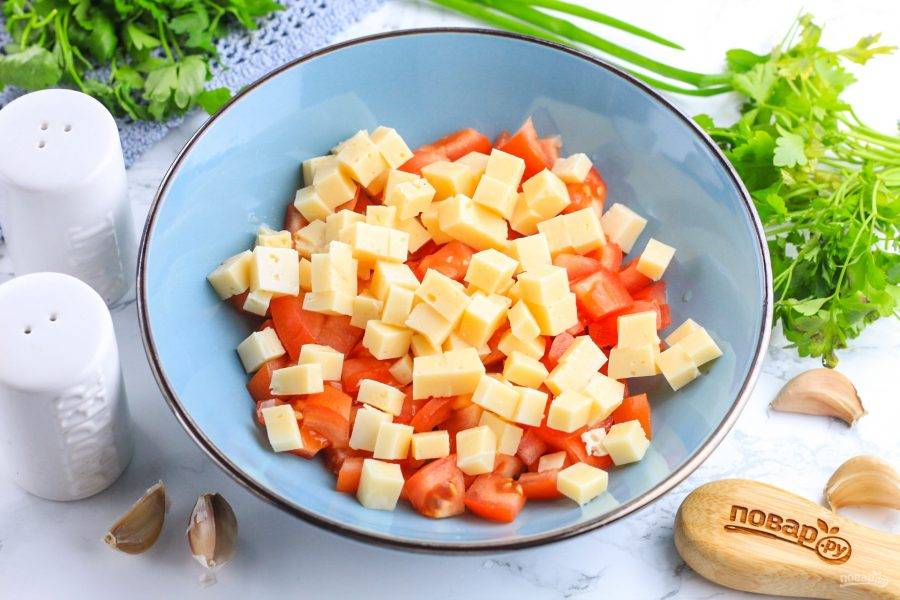 Твердый сыр любого сорта нарежьте точно такими же кубиками и добавьте к помидорам.