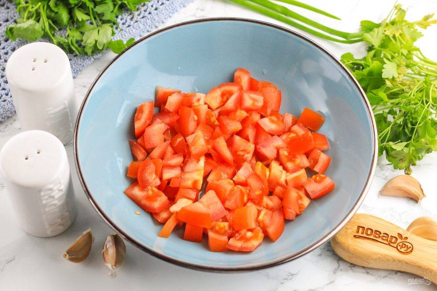 Помидоры промойте в воде, вырежьте зеленые сердцевинки. Нарежьте помидоры мелкими или средними кубиками. Выложите нарезку в салатник.