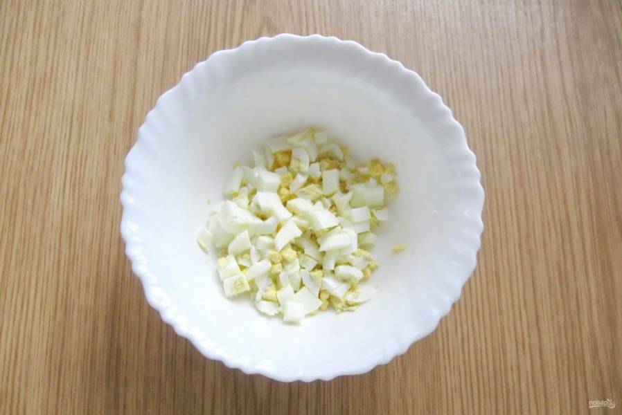 Яйца сварите вкрутую, охладите, очистите и мелко нарежьте.