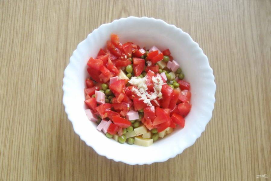 Чеснок мелко нарежьте или натрите на мелкой терке. Выложите в салат.