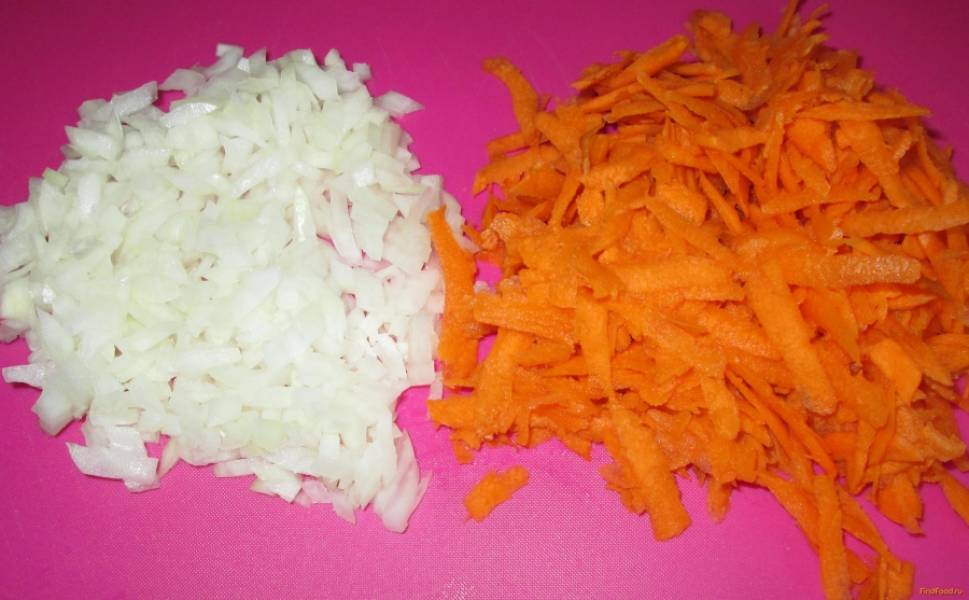 Следующее, что нам нужно сделать это помыть и почистить морковь и лук. Морковь натереть на крупной терке, а лук порезать как можно мельче.