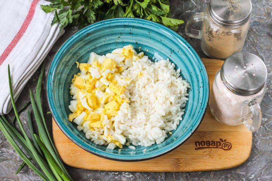 Очистите от скорлупы отварное куриное яйцо, промойте его в воде и нарежьте мелким кубиком. Выложите в глубокую емкость вместе с вареным рисом.