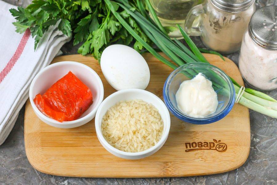 Сытный и аппетитный салат с рисом и красной рыбой станет изюминкой вашего стола. Готовится он легко и быстро, если вы заранее отварите рис и куриные яйца. Заправлять блюдо лучше всего майонезом.