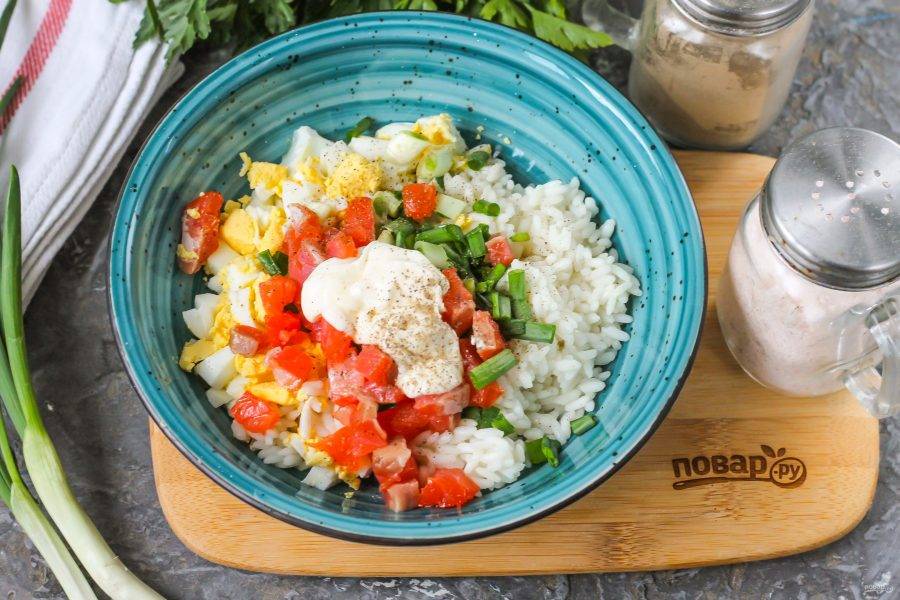 Добавьте майонез любой жирности, посолите и поперчите по вкусу. Аккуратно перемешайте салат в емкости.