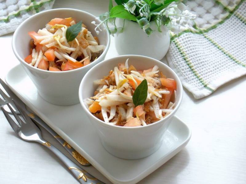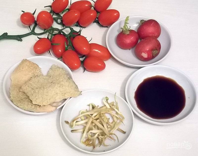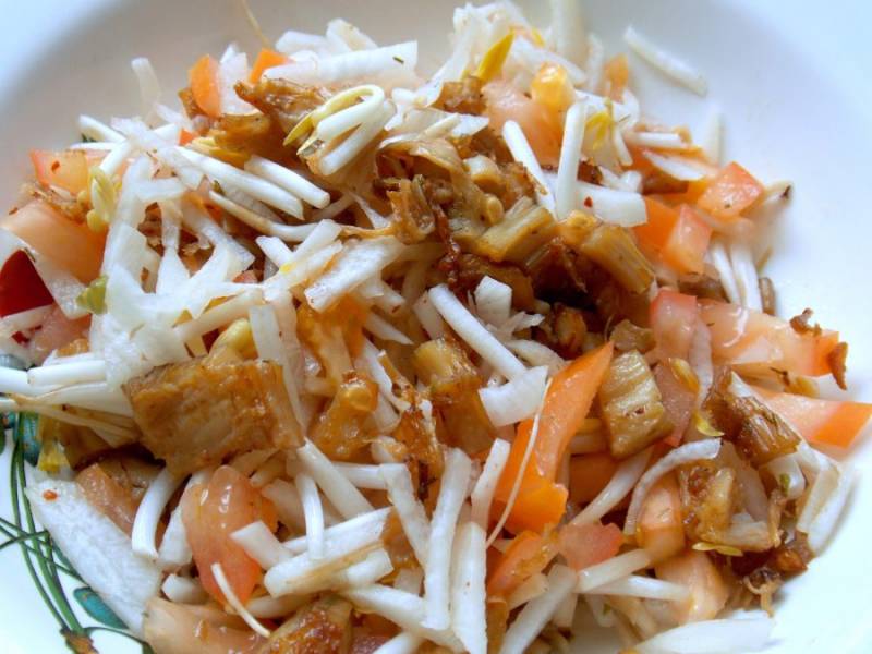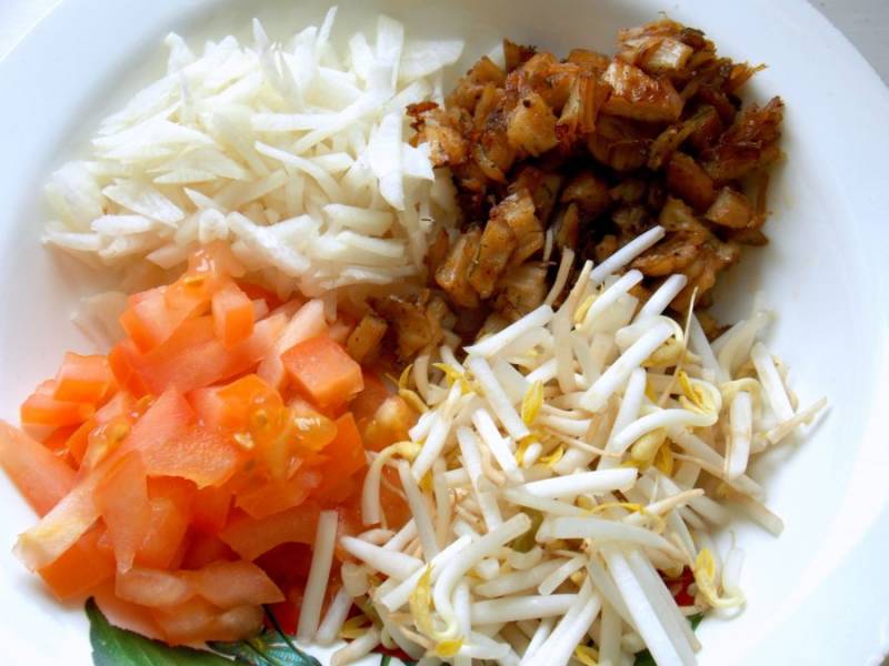 Порежьте соломкой помидоры, редис. Добавьте ростки фасоли, рубец.