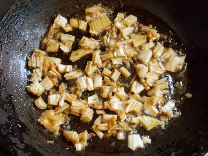 Порежьте рубец средним кубиком и обжарьте на растительном масле 3-4 минуты. Добавьте соевый соус, обжарьте еще 3-4 минуты.