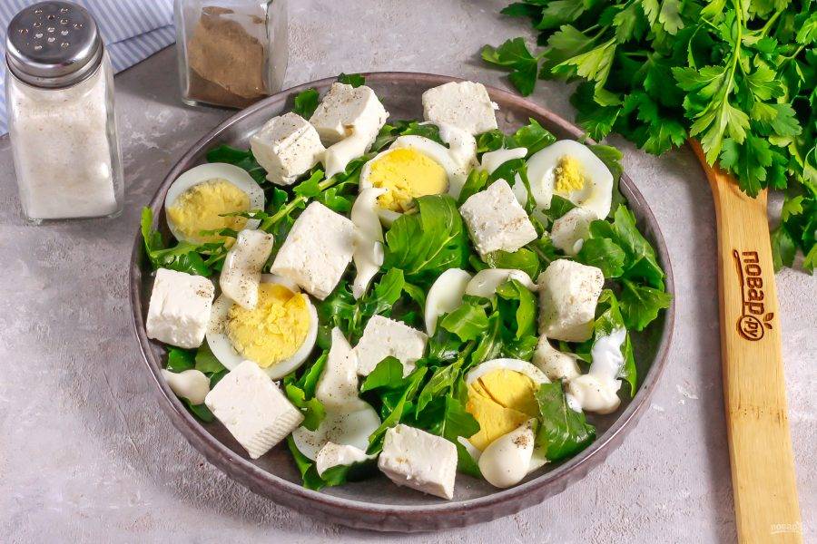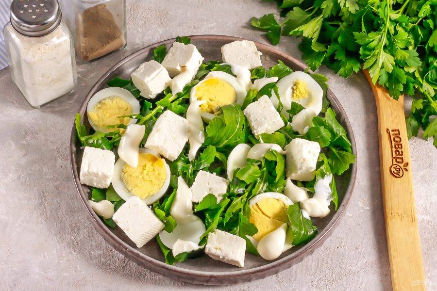 Выложите майонез любой жирности в хаотичном порядке на салат.