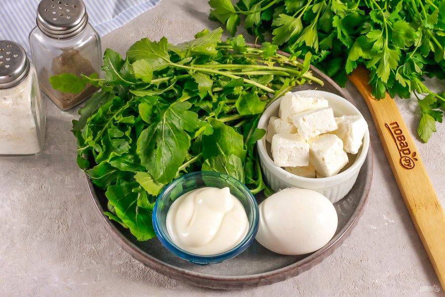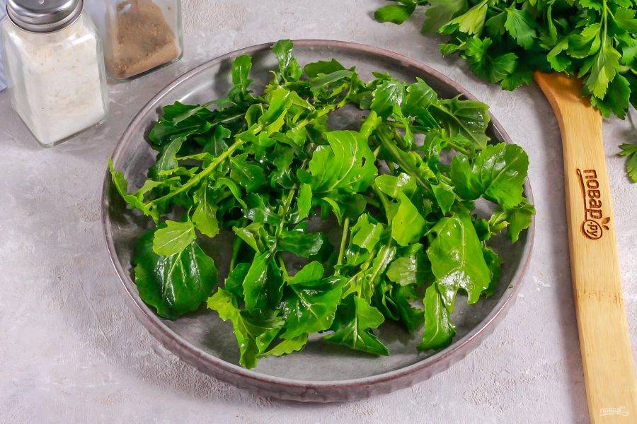 Промойте рукколу в воде, стряхните лишнюю влагу или обсушите зелень бумажными салфетками. Срежьте длинные стебли и выложите на тарелку.