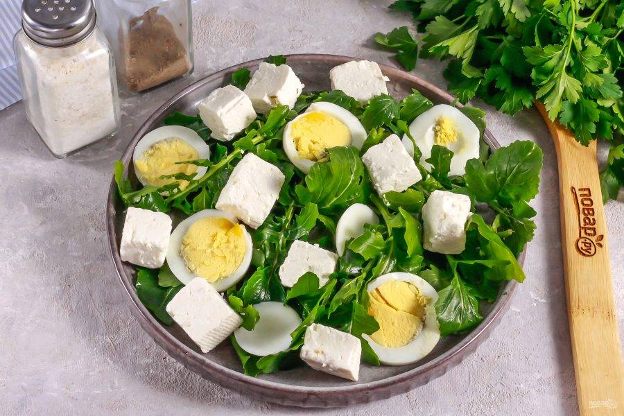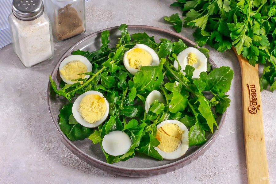 Отварное куриное яйцо очистите от скорлупы и промойте в воде. Нарежьте кружочками и выложите на рукколу.