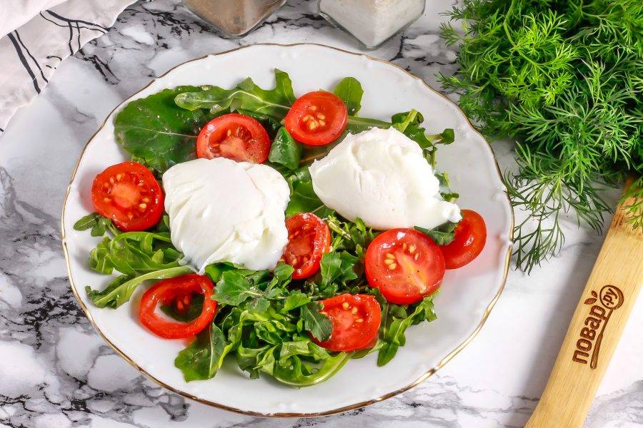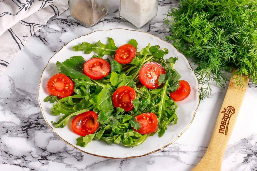 Промойте помидоры и нарежьте кружочками. Выложите на листья рукколы.
